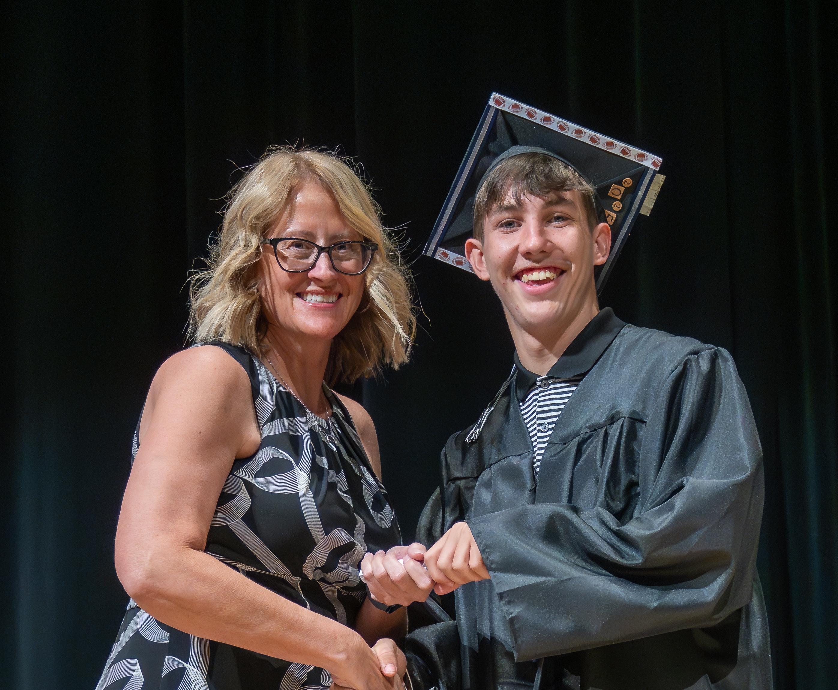 Celebrating a moment of triumph, Carver shares a high-five with Principal Leslie Lehnertz as he receives his diploma.